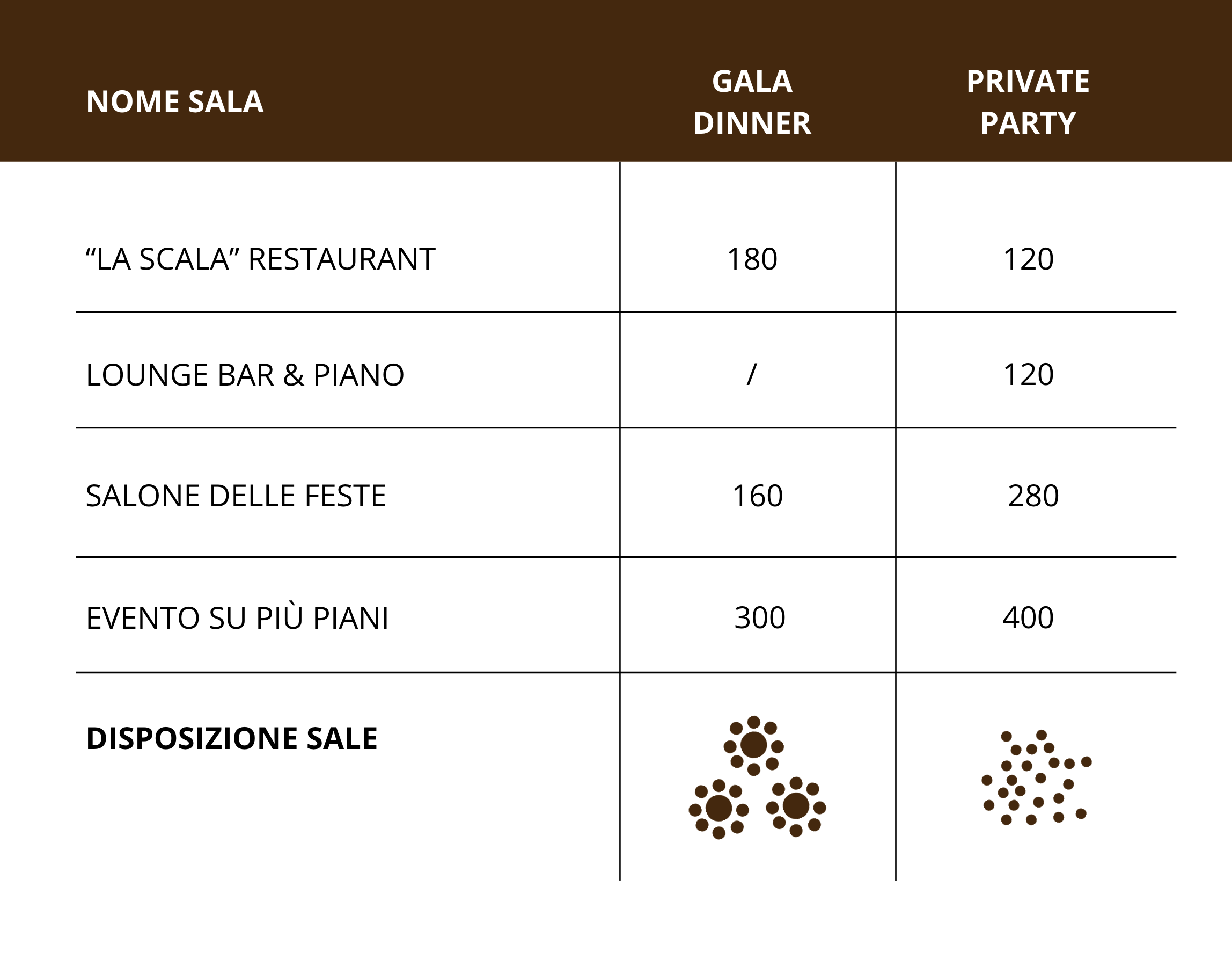 Possibilità di servizio al tavolo o a buffet.